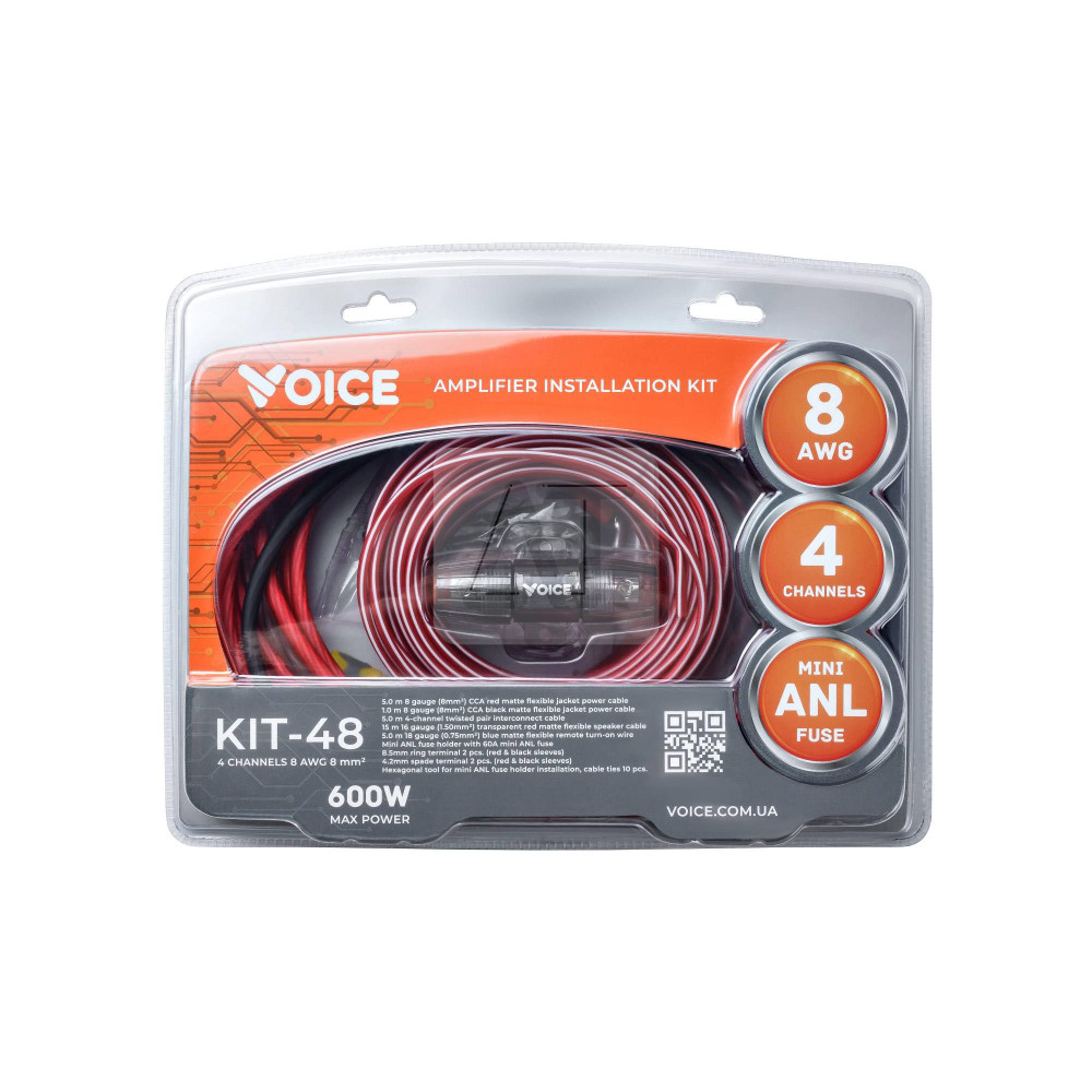 Voice KIT-48 — это универсальный монтажный комплект, разработанный для удобного и надёжного подключения 4-канального усилителя. Всё необходимое — в одном наборе: силовые, акустические, управляющие кабели, RCA, клеммы и защита питания.